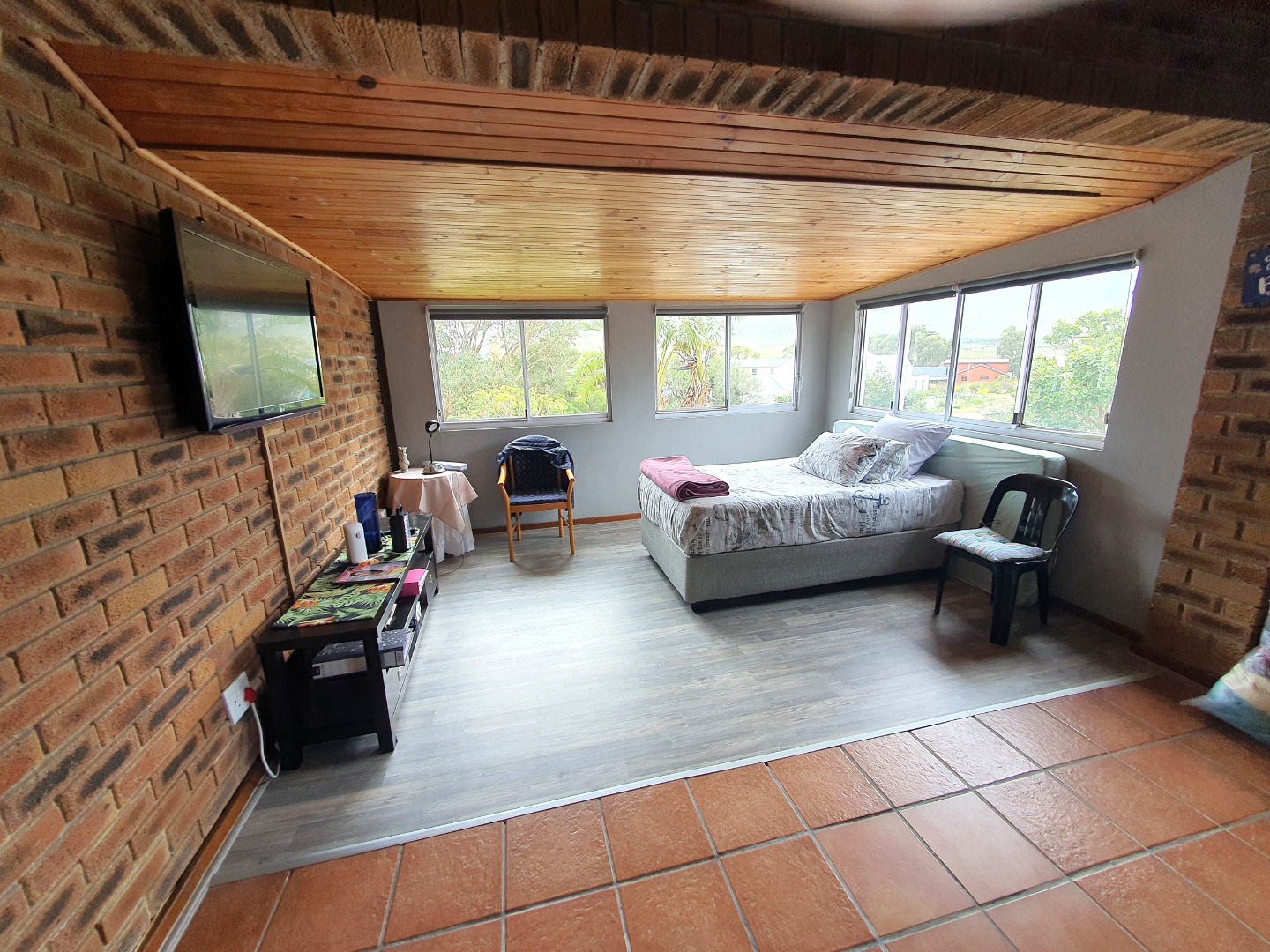 Upstairs you find a small lounge, two bedrooms and two bathrooms. The large main bedroom offers plenty of cupboard space and the full en-suite bathroom features a modern soaking bathtub.