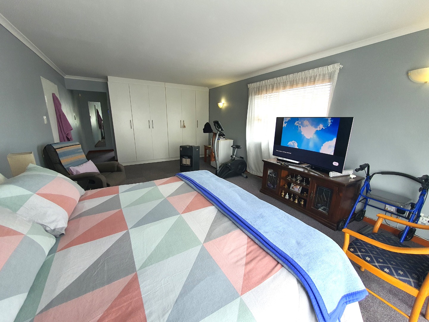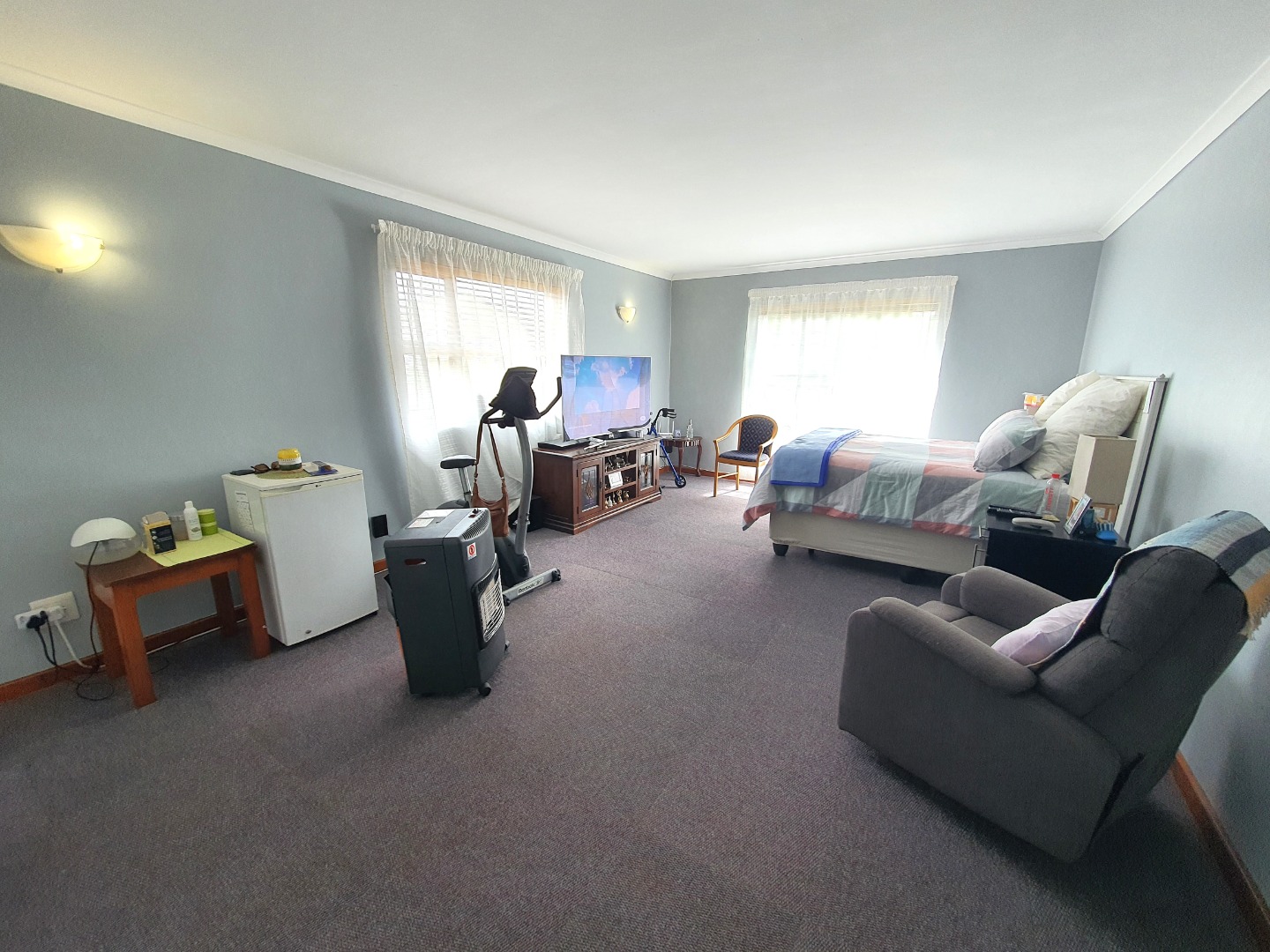 The sunny family room is presently used as a fourth bedroom.