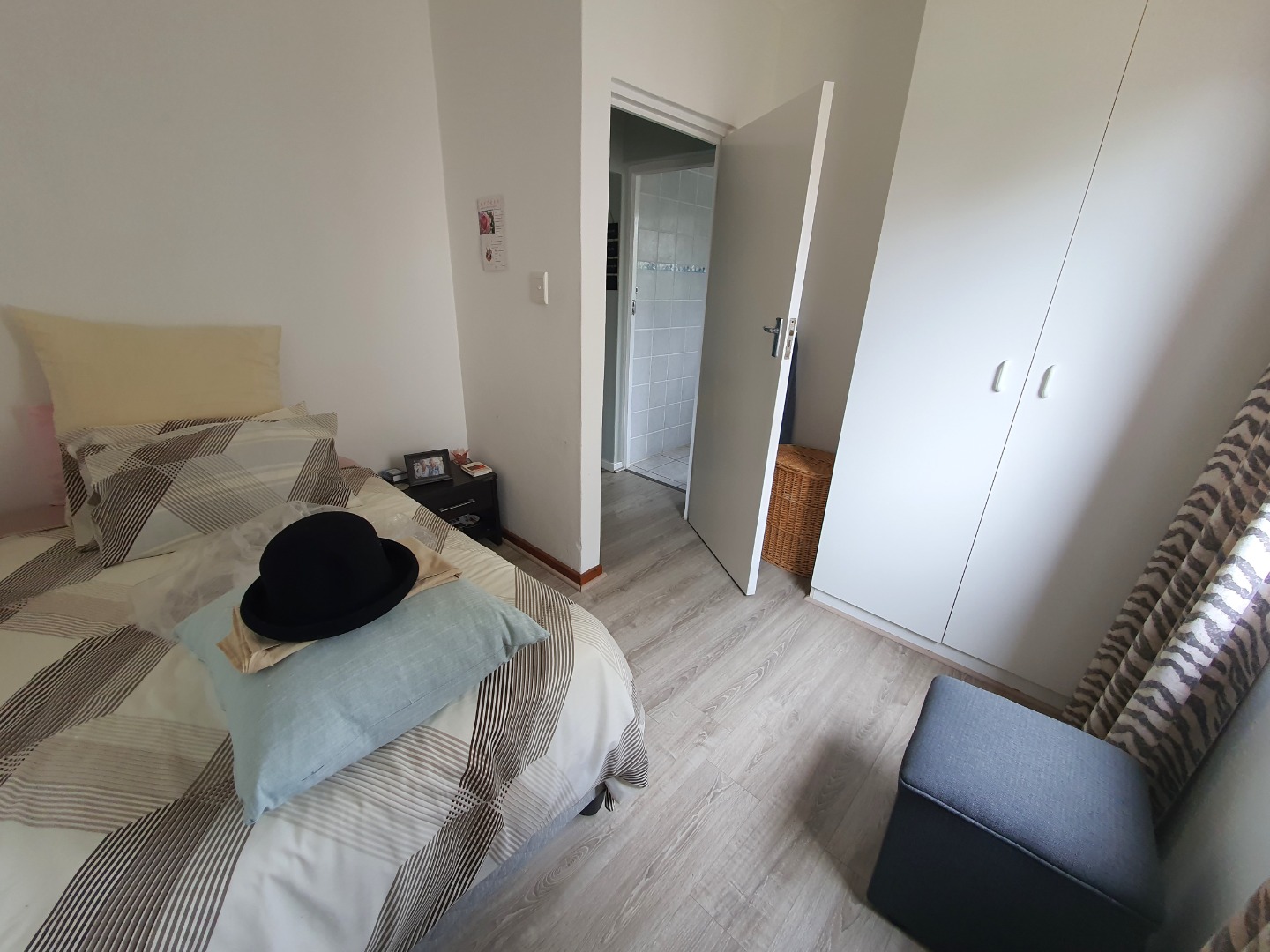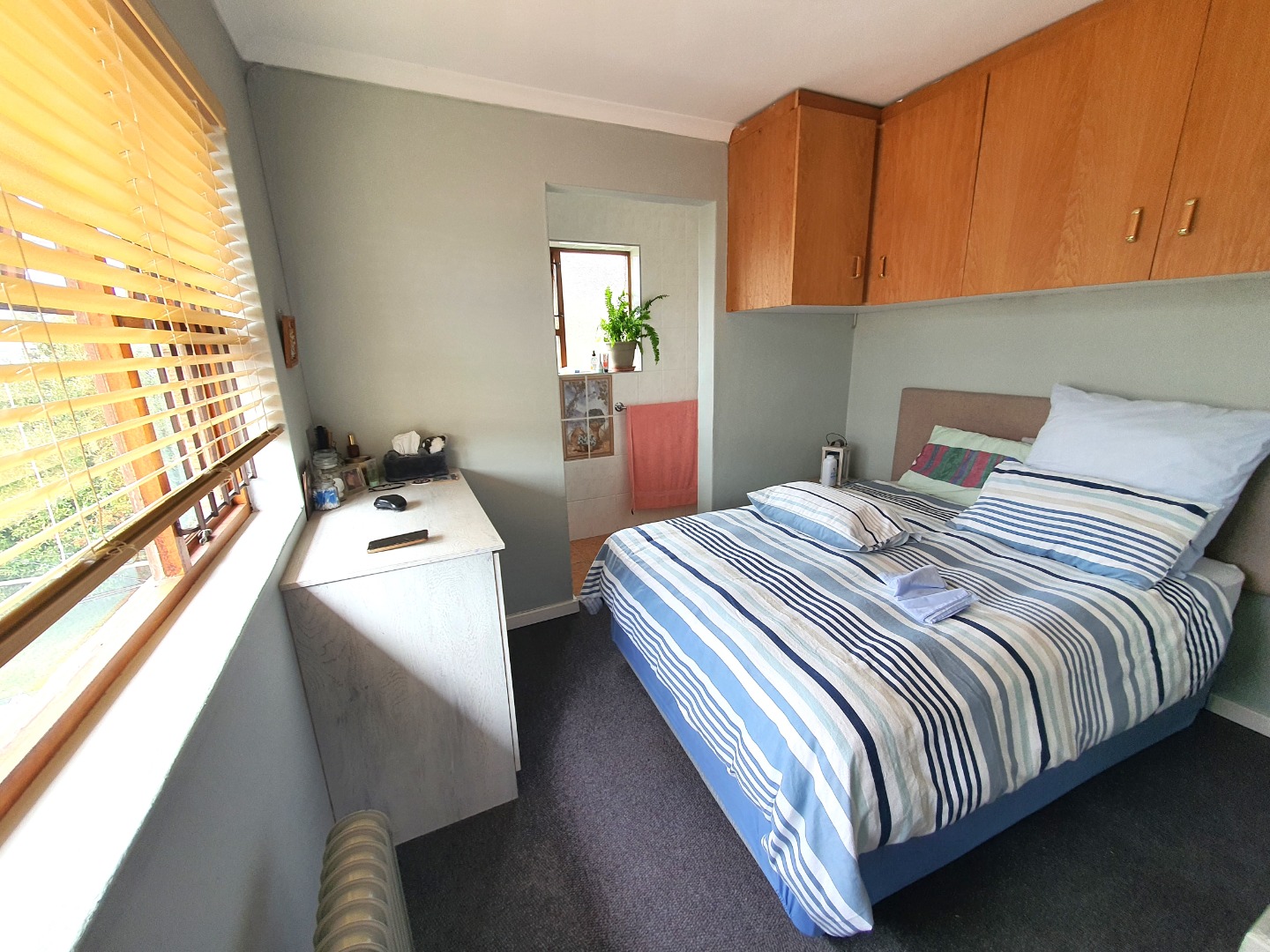 Downstairs a large open-plan living area and nice kitchen. Small study plus one bedroom with built-in cupboards and a separate bathroom.