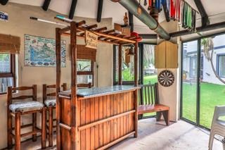 To relax with family and friends there is a sunken seating area with a built-in fireplace. The outdoor area features a built-in bar and pizza oven.
